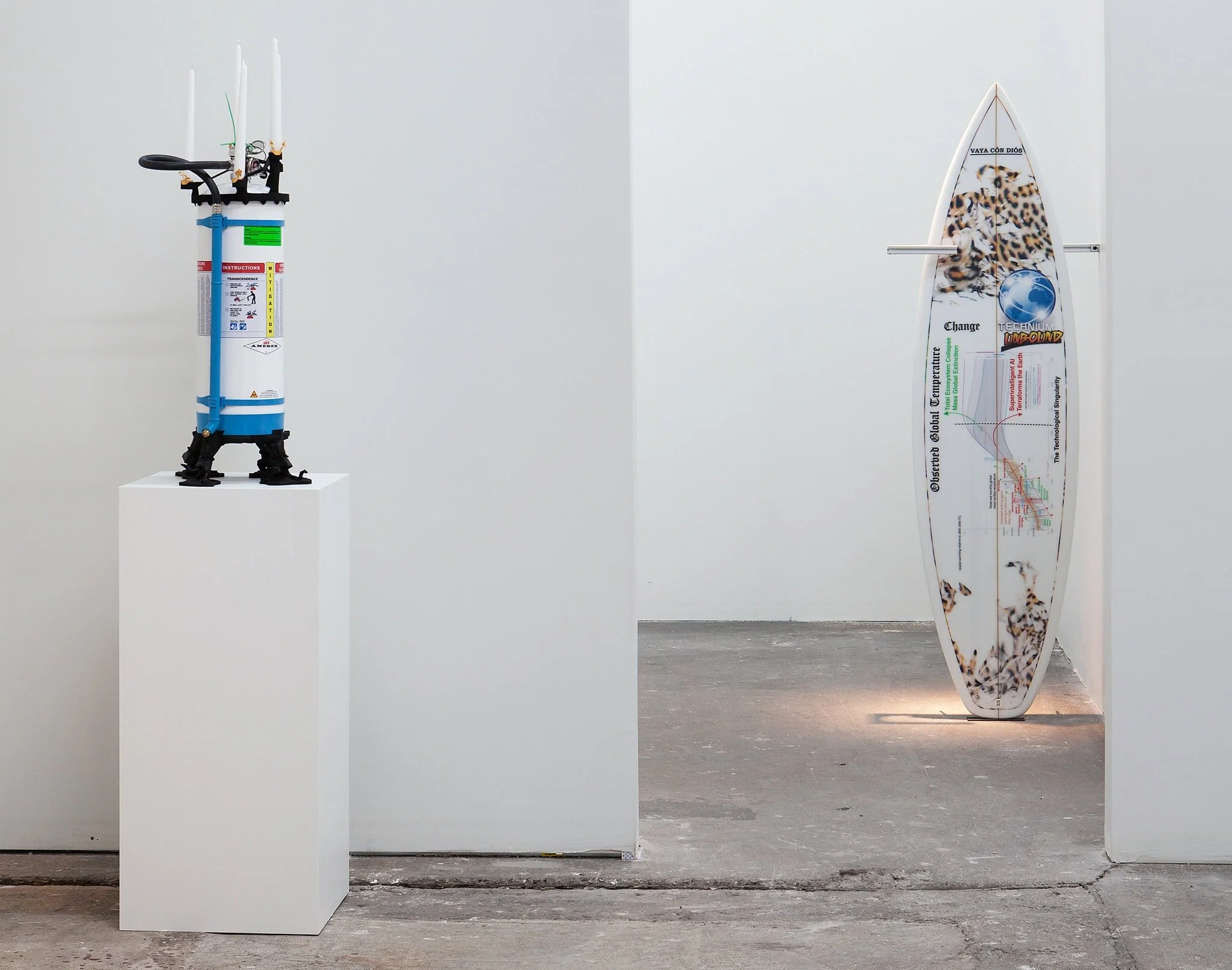 The front of the surfboard-shaped “Escape Vehicle 001” (2020) features a graph of the global temperature overlaid with stock price trading diagrams. It’s shooting toward either the collapse of our ecosystem or A.I. saving the planet. Despite the promise of the work’s title, its form suggests another lesson: We can’t escape the future so much as find a way to ride on through it.